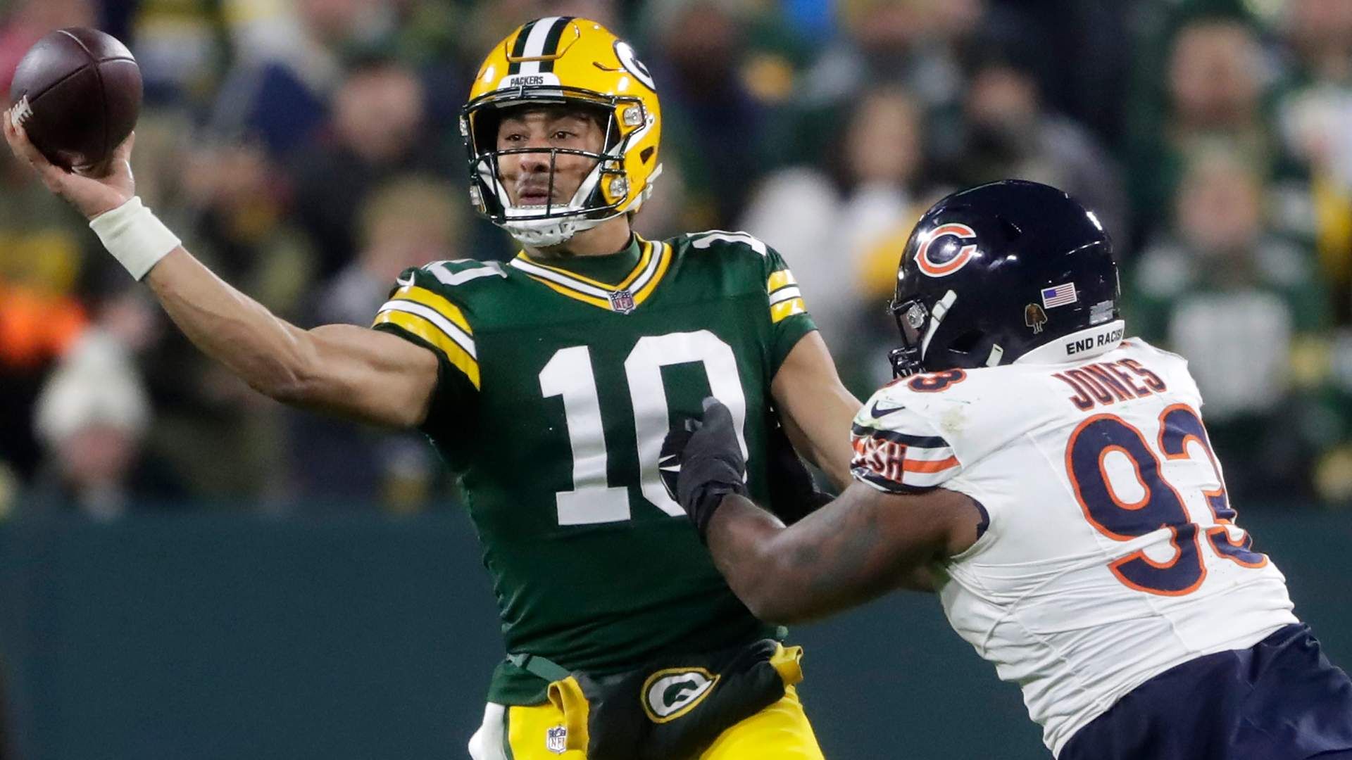 Green Bay Packers quarterback Jordan Love (10) throws under pressure from Chicago Bears defensive tackle Justin Jones (93) during their football game Sunday, January 7, 2024, at Lambeau Field in Green Bay, Wis. The Packers defeated the Bears 17-9. Photo Credit: Wm. Glasheen / USA TODAY NETWORK-Wisconsin / USA TODAY NETWORK