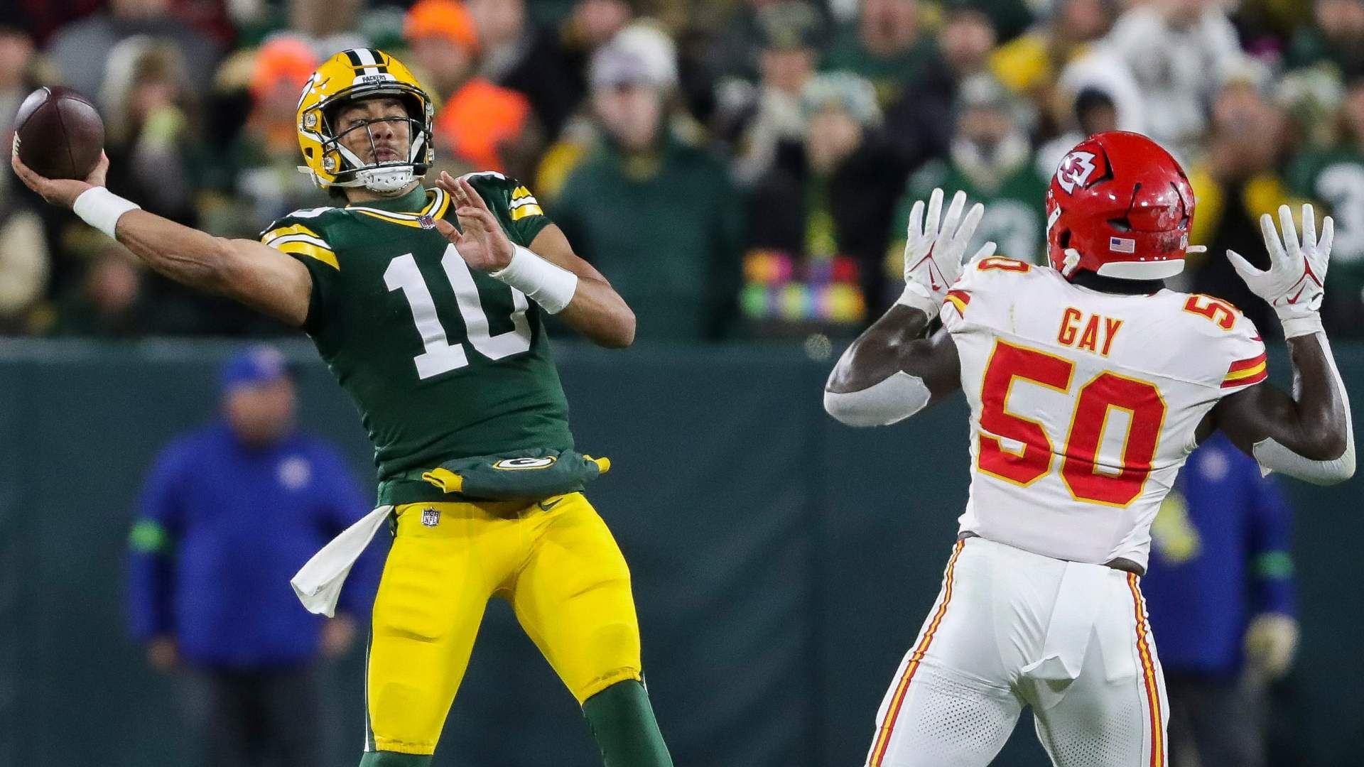 Green Bay Packers quarterback Jordan Love (10) passes the ball against the Kansas City Chiefs on Sunday, December 3, 2023, at Lambeau Field in Green Bay, Wis. The Packers won the game, 27-19. Photo Credit: Tork Mason/USA TODAY NETWORK-Wisconsin