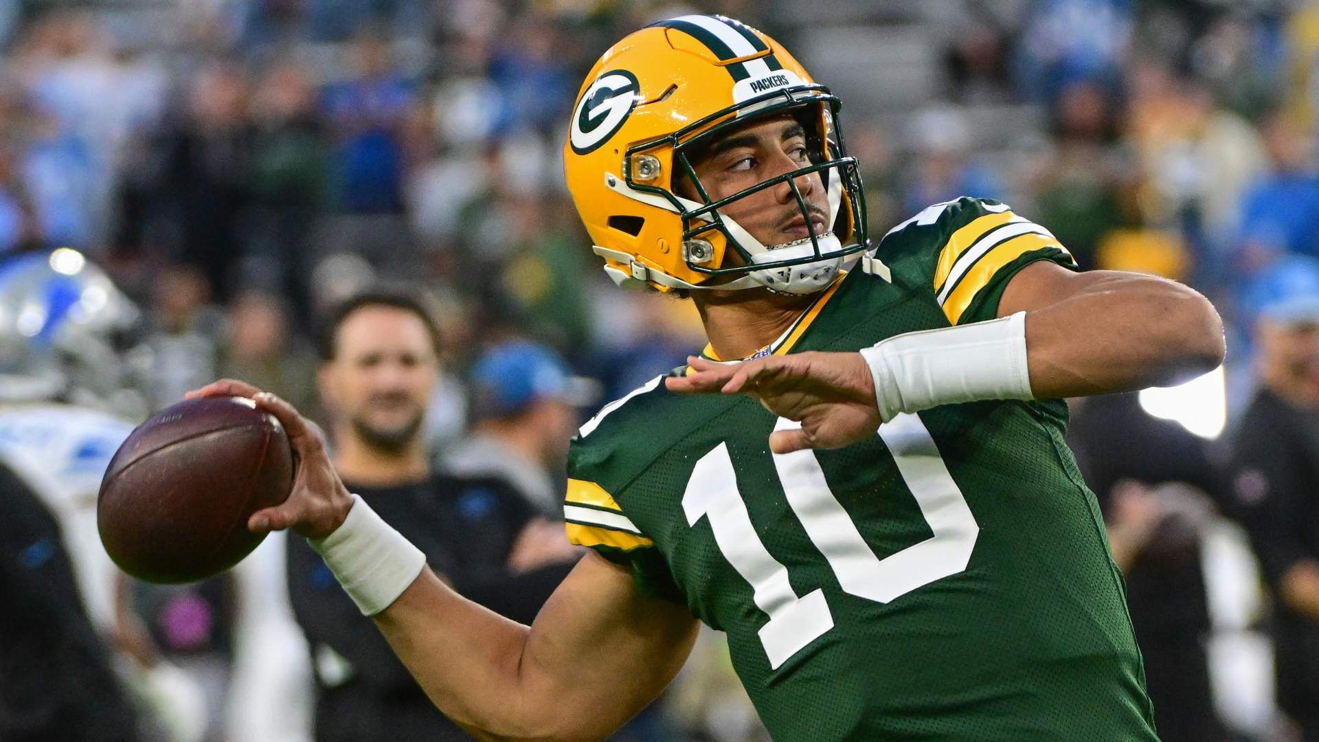 Sep 28, 2023; Green Bay, Wisconsin, USA; Green Bay Packers quarterback Jordan Love (10) warms up before game against the Detroit Lions at Lambeau Field. Mandatory Credit: Benny Sieu-USA TODAY Sports