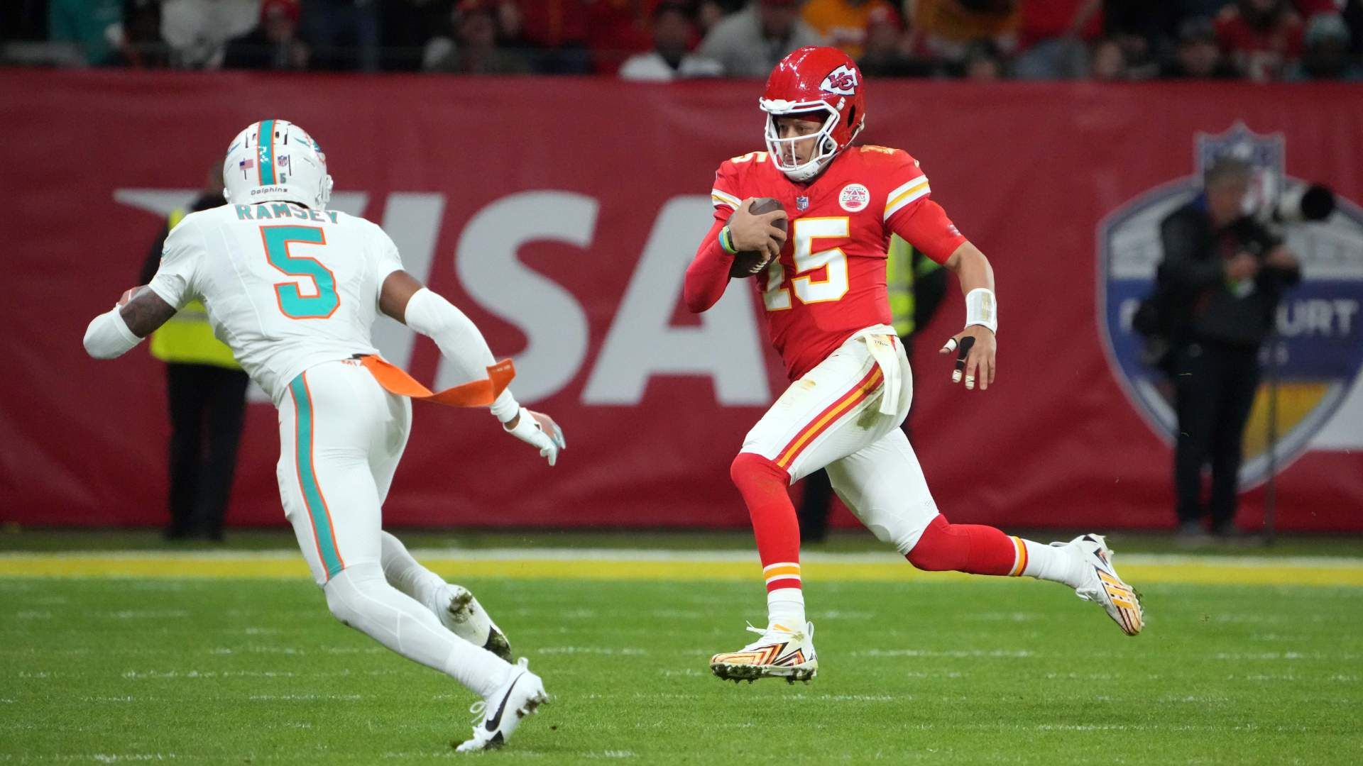 Nov 5, 2023; Frankfurt, Germany; Kansas City Chiefs quarterback Patrick Mahomes (15) carries the ball against Miami Dolphins cornerback Jalen Ramsey (5) in the second half during an NFL International Series game at Deutsche Bank Park. Mandatory Credit: Kirby Lee-USA TODAY Sports