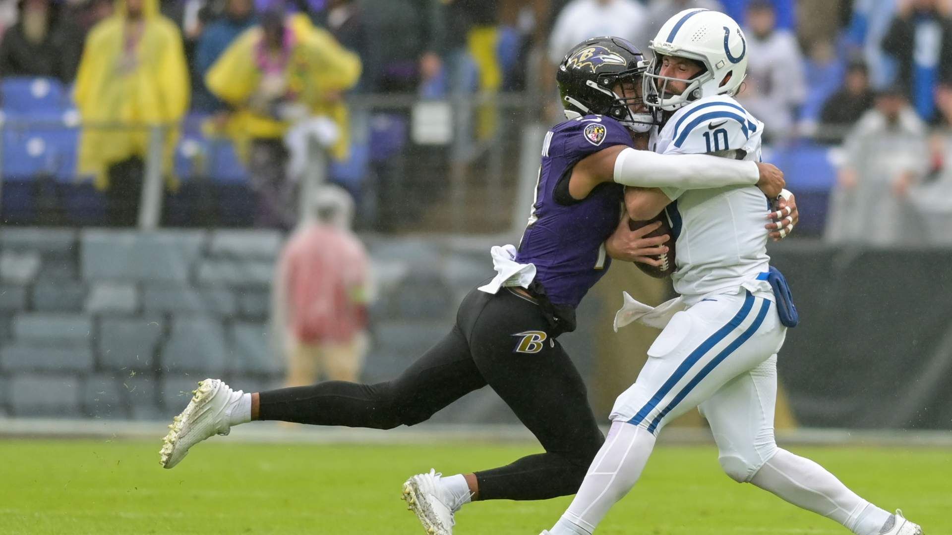 Sep 24, 2023; Baltimore, Maryland, USA; Baltimore Ravens safety Kyle Hamilton (14) sacks Indianapolis Colts quarterback Gardner Minshew (10) during the first quarter during the first quarter at M&T Bank Stadium. Mandatory Credit: Tommy Gilligan-USA TODAY Sports