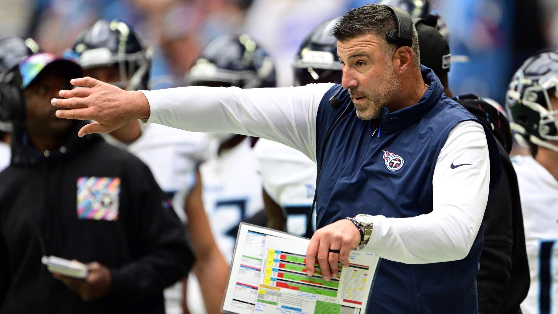 Oct 8, 2023; Indianapolis, Indiana, USA; Tennessee Titans head coach Mike Vrabel motions to his team during the first quarter against the Indianapolis Colts at Lucas Oil Stadium. Mandatory Credit: Marc Lebryk-USA TODAY Sports
