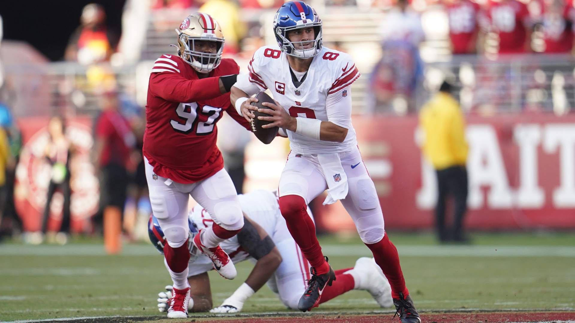 Sep 21, 2023; Santa Clara, California, USA; New York Giants quarterback Daniel Jones (8) runs with the ball ahead of San Francisco 49ers defensive end Kerry Hyder Jr. (92) in the first quarter at Levi's Stadium. Mandatory Credit: Cary Edmondson-USA TODAY Sports