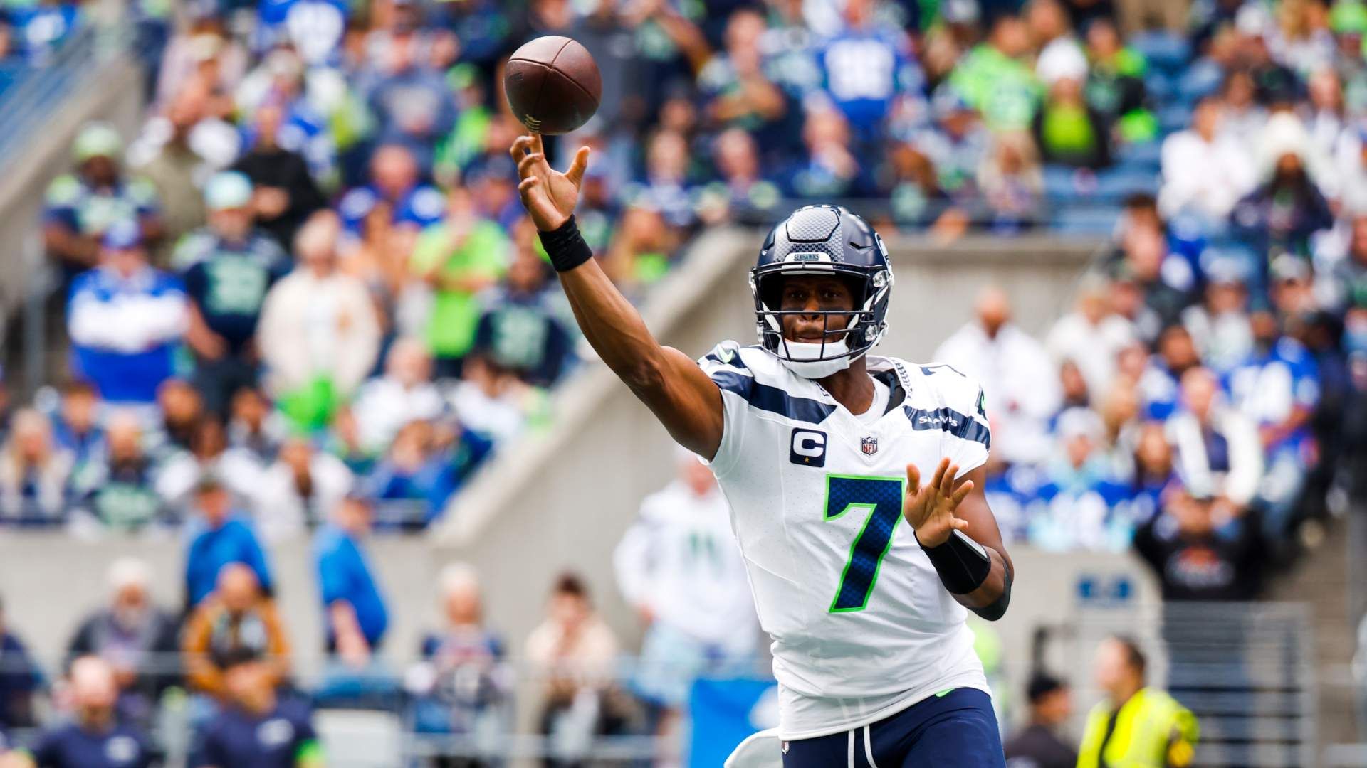 Sep 24, 2023; Seattle, Washington, USA; Seattle Seahawks quarterback Geno Smith (7) passes against the Carolina Panthers during the first quarter at Lumen Field. Mandatory Credit: Joe Nicholson-USA TODAY Sports