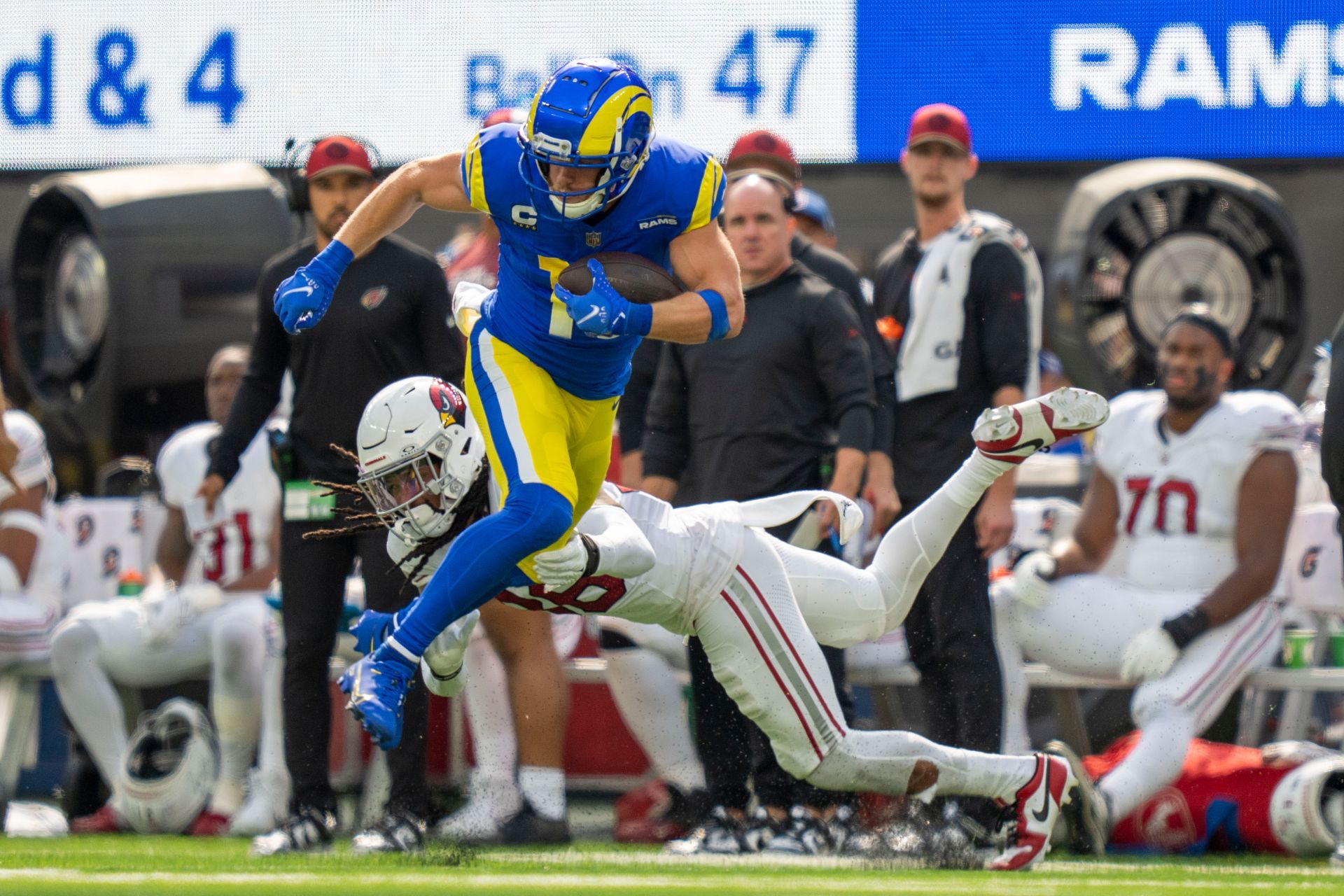 October 15, 2023; Inglewood, California, USA; Los Angeles Rams wide receiver Cooper Kupp (10) runs the football against Arizona Cardinals safety Andre Chachere (36) during the first quarter at SoFi Stadium. Mandatory Credit: Kyle Terada-USA TODAY Sports
