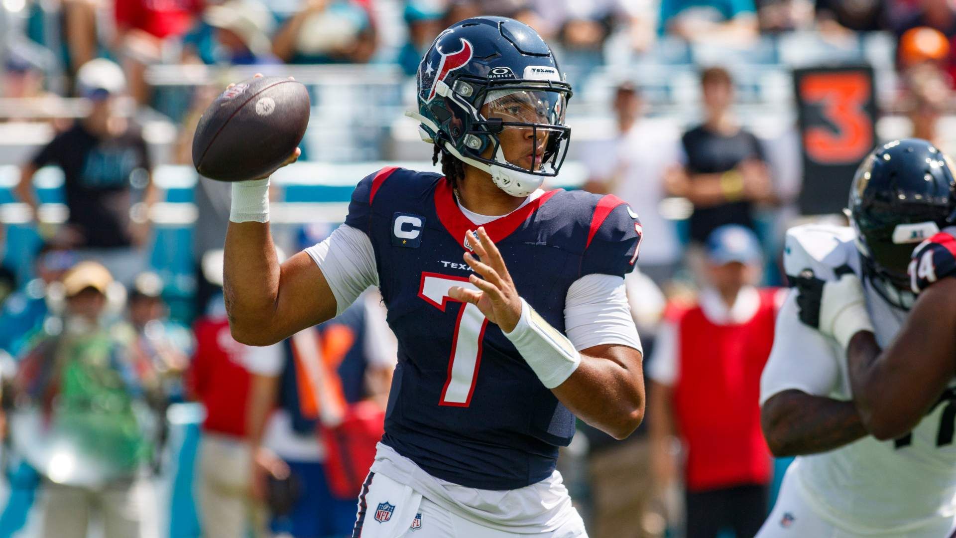 Sep 24, 2023; Jacksonville, Florida, USA; Houston Texans quarterback C.J. Stroud (7) throws a pass against the Jacksonville Jaguars during the first quarter at EverBank Stadium. Mandatory Credit: Morgan Tencza-USA TODAY Sports