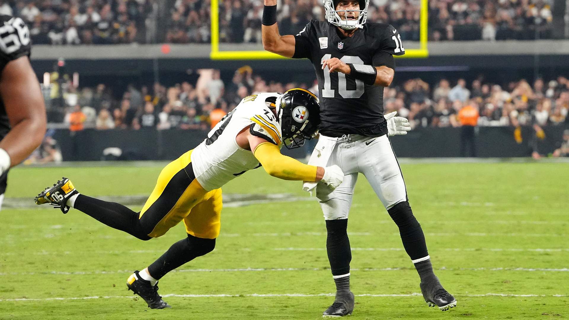 Sep 24, 2023; Paradise, Nevada, USA; Las Vegas Raiders quarterback Jimmy Garoppolo (10) is hit by Pittsburgh Steelers linebacker T.J. Watt (90) after making a pass during the fourth quarter at Allegiant Stadium. Mandatory Credit: Stephen R. Sylvanie-USA TODAY Sports