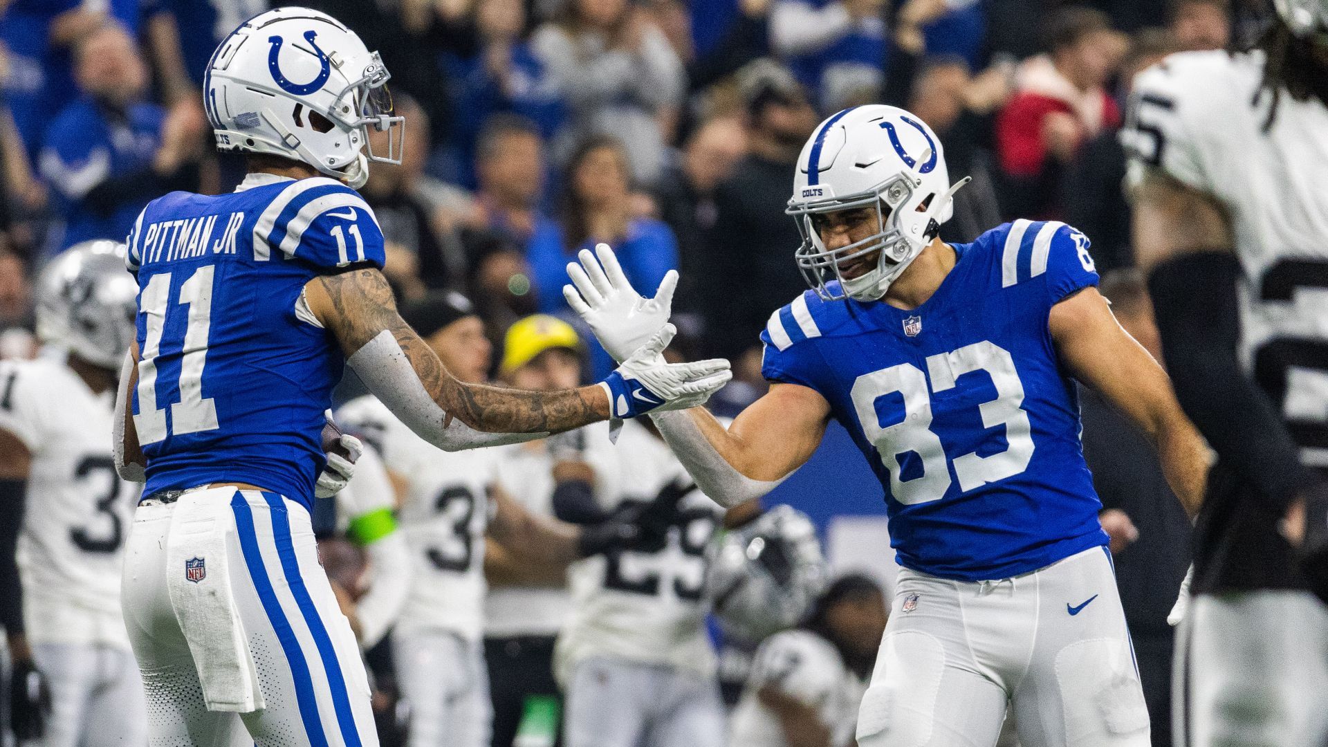 Dec 31, 2023; Indianapolis, Indiana, USA; Indianapolis Colts wide receiver Michael Pittman Jr. (11) and tight end Kylen Granson (83) celebrate a first down in the second half against the Las Vegas Raiders at Lucas Oil Stadium. Mandatory Credit: Trevor Ruszkowski-USA TODAY Sports