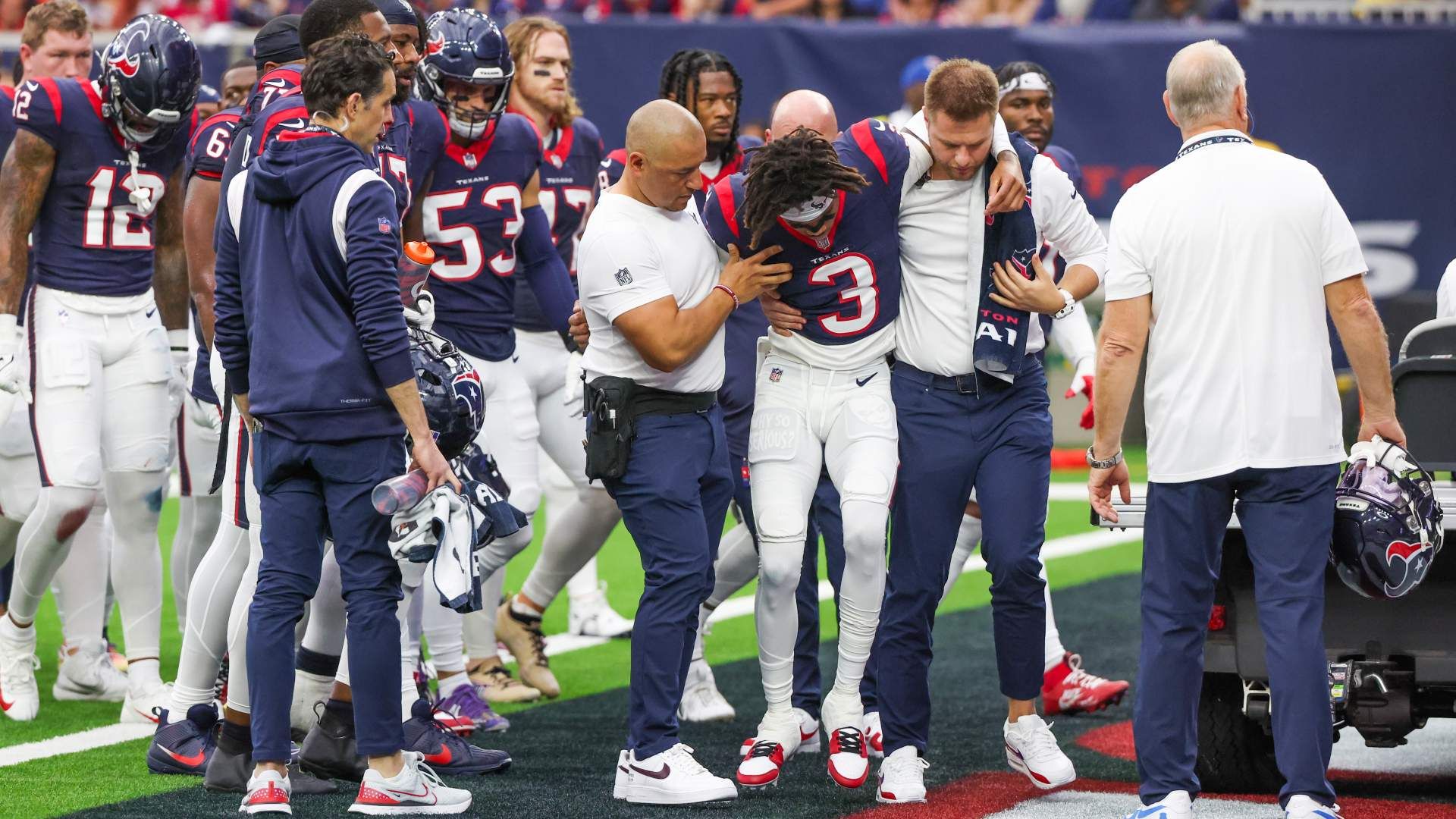 Dec 3, 2023; Houston, Texas, USA; Trainers move an injured Houston Texans wide receiver Tank Dell (3) two the cart as he injured himself on a touchdown play against the Denver Broncos at NRG Stadium. Mandatory Credit: Thomas Shea-USA TODAY Sports