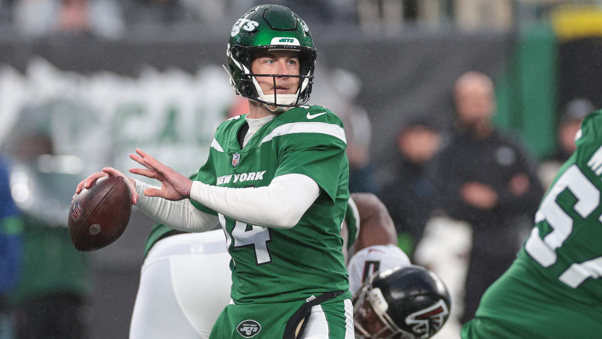 Dec 3, 2023; East Rutherford, New Jersey, USA; New York Jets quarterback Trevor Siemian (14) throws the ball during the second half against the Atlanta Falcons at MetLife Stadium. Mandatory Credit: Vincent Carchietta-USA TODAY Sports