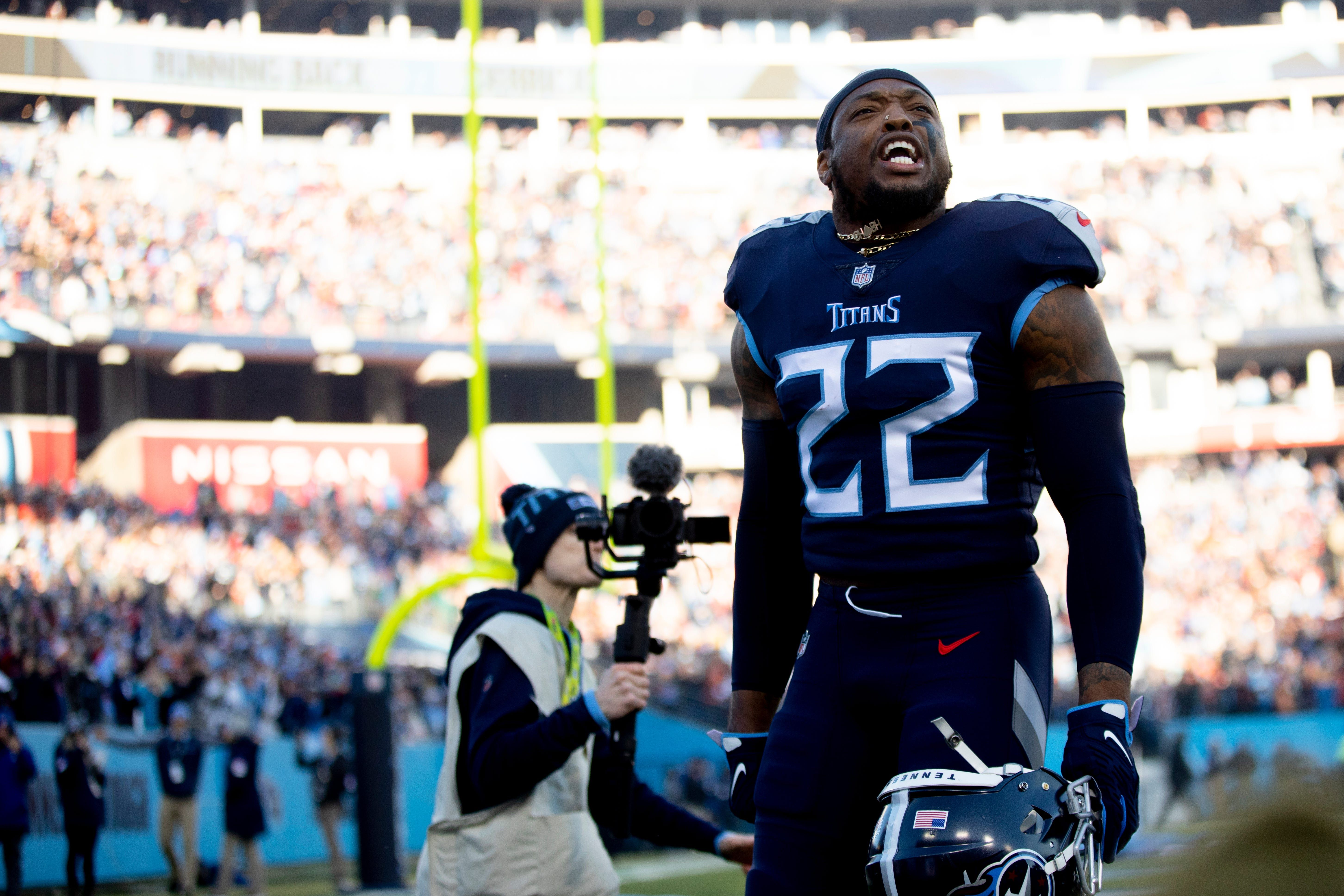 Tennessee Titans running back Derrick Henry (22) takes the field before an NFL divisional playoff football game, Saturday, Jan. 22, 2022, at Nissan Stadium in Nashville, Tenn. Cincinnati Bengals defeated Tennessee Titans 19-16. Cincinnati Bengals At Tennessee Titans Divisional Playoff 67