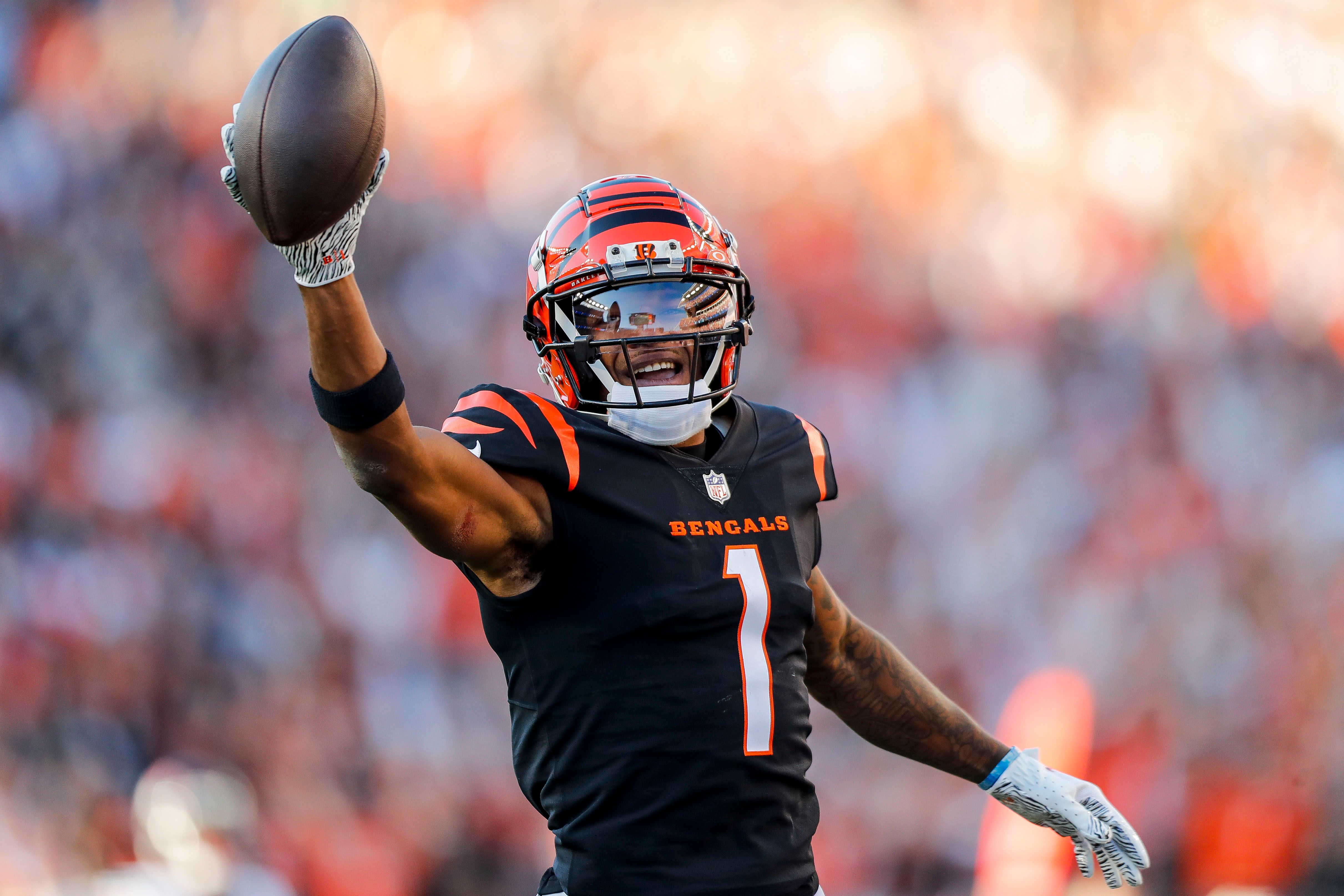 Nov 12, 2023; Cincinnati, Ohio, USA; Cincinnati Bengals wide receiver Ja'Marr Chase (1) runs the ball in for a touchdown against the Houston Texans in the second half at Paycor Stadium. Mandatory Credit: Katie Stratman-USA TODAY Sports