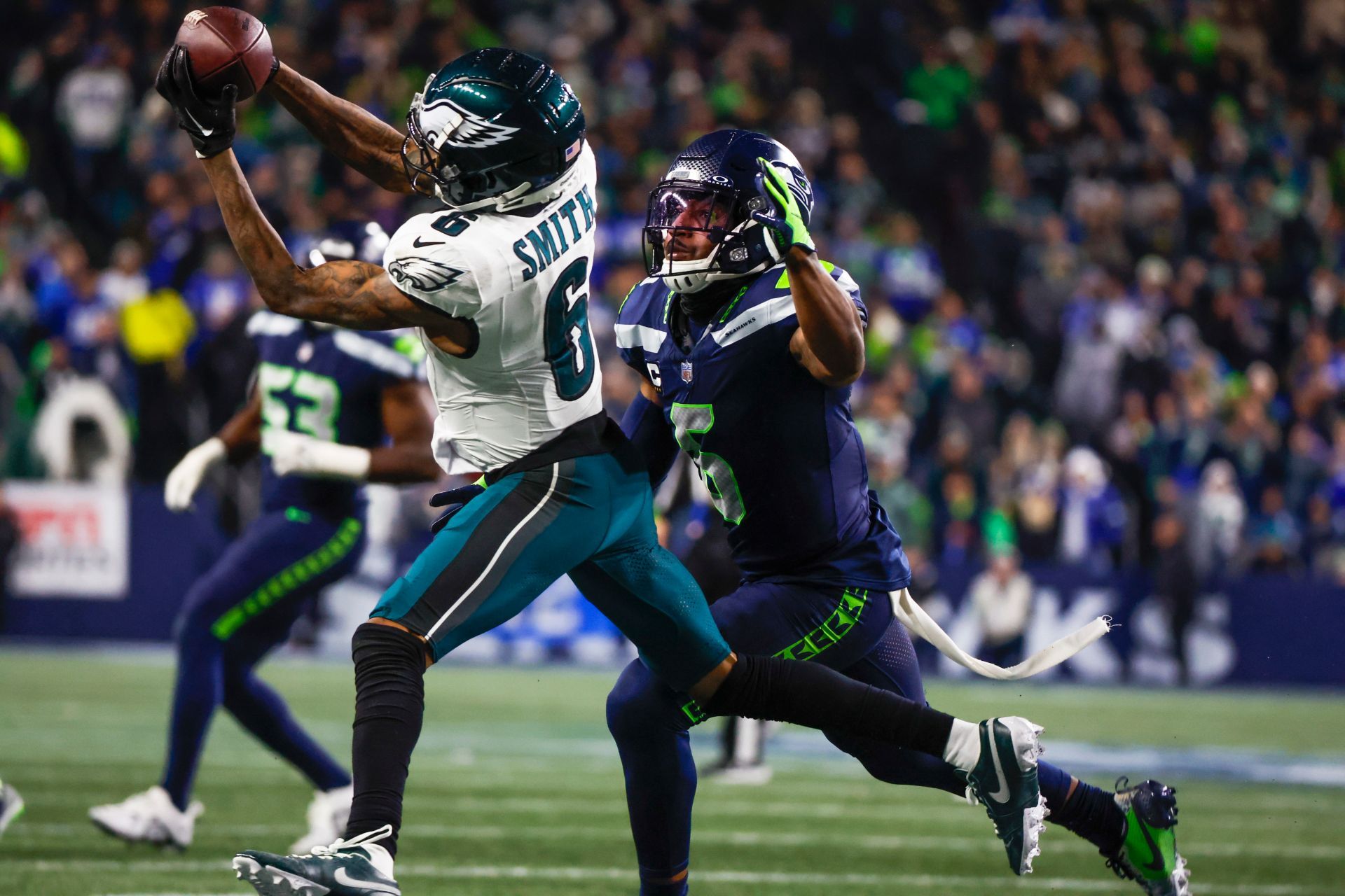 Dec 18, 2023; Seattle, Washington, USA; Philadelphia Eagles wide receiver DeVonta Smith (6) catches a pass against Seattle Seahawks safety Quandre Diggs (6, right) during the third quarter at Lumen Field. Mandatory Credit: Joe Nicholson-USA TODAY Sports