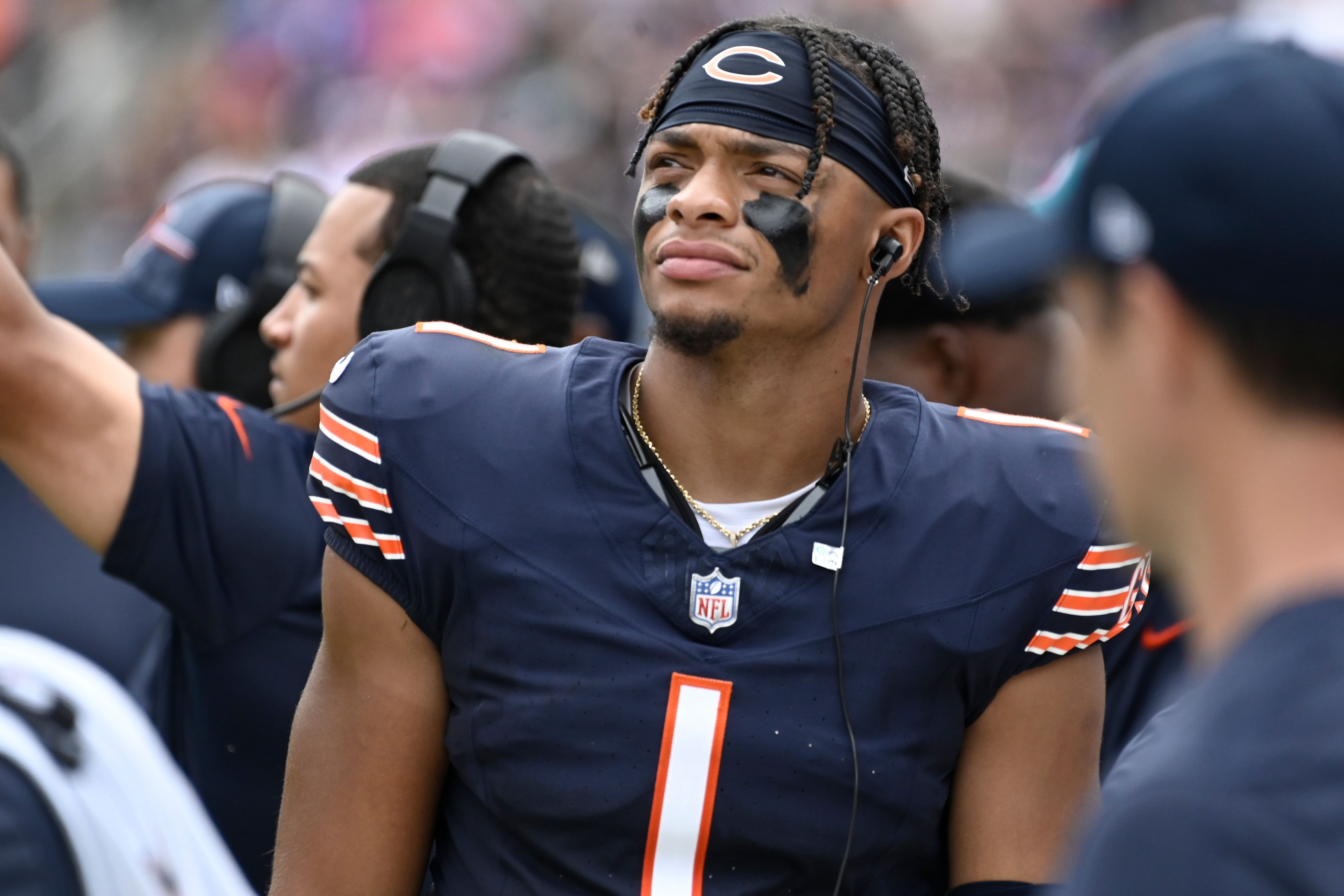Aug 26, 2023; Chicago, Illinois, USA; Chicago Bears quarterback Justin Fields (1) looks on from the sidelines during the first half against the Buffalo Bills at Soldier Field. Mandatory Credit: Matt Marton-USA TODAY Sports